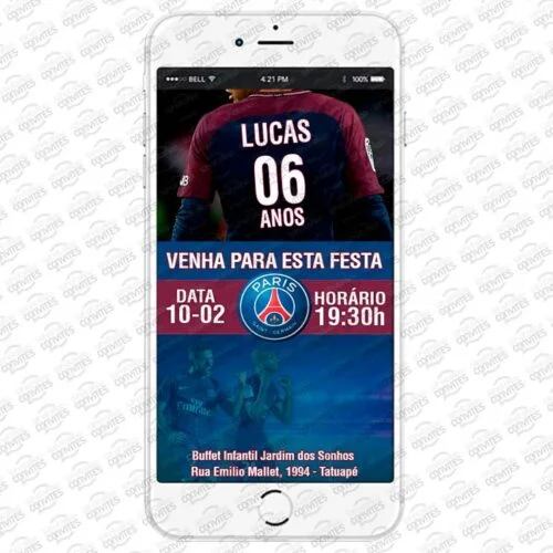 A criação do Convite Digital será feita com base no modelo apresentado na imagem Convite Virtual PSG Paris Saint Germain.